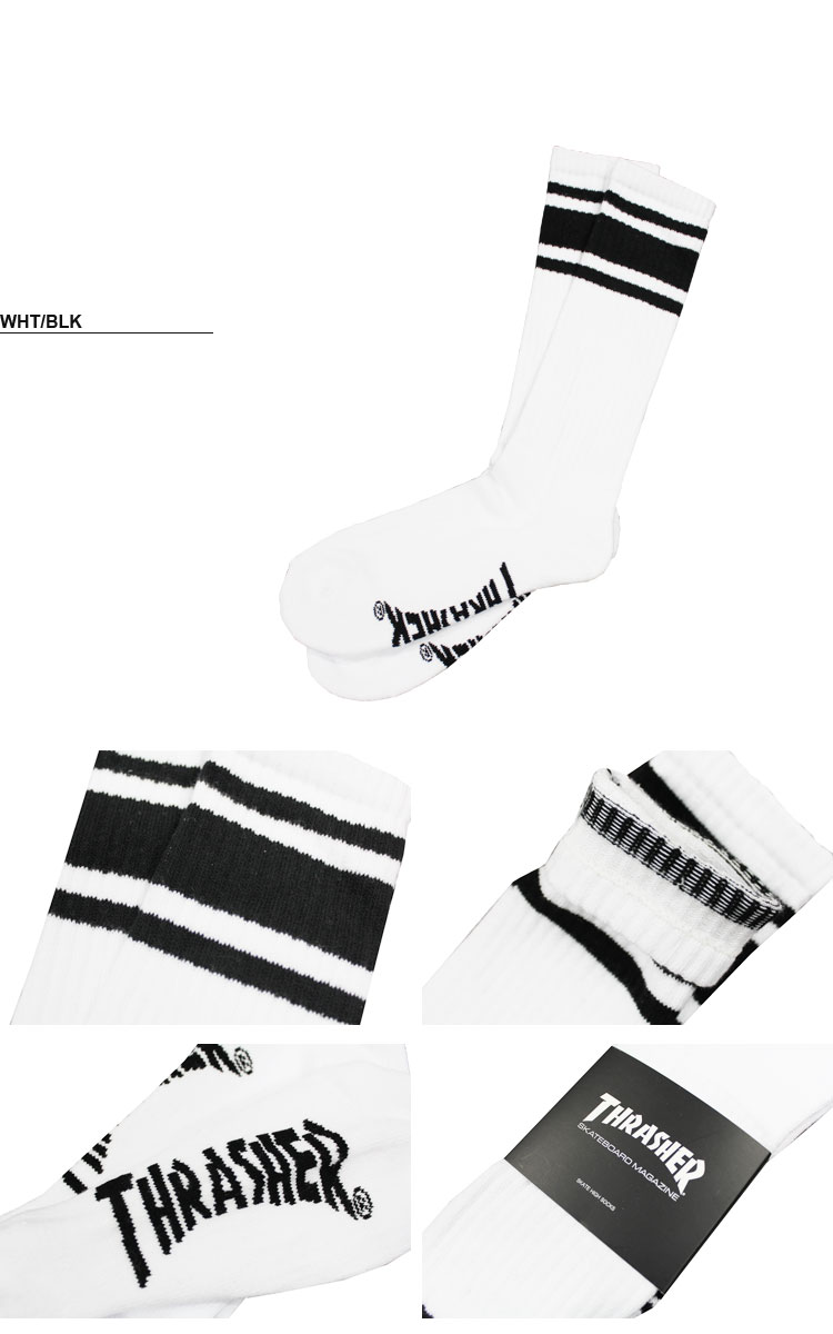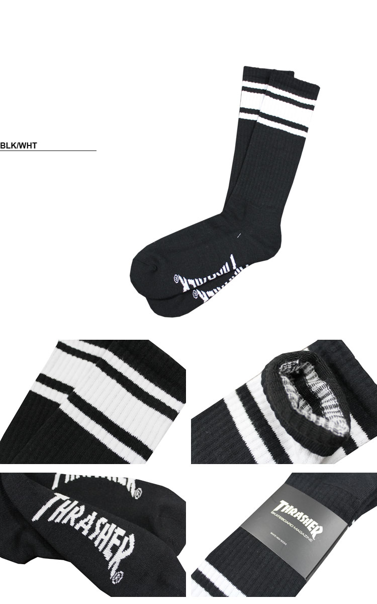 商品名 MAG SKATER SOCKS ブランド THRASHER(スラッシャー) カラー BLK/WHT、WHT/BLK、WHT/NVY 素材 綿 ポリエステル ポリウレタン 注意事項 お客様のお使いのPC、モニターの環境により商品のイメージ写真の色などが実際と違って見えることがあります。