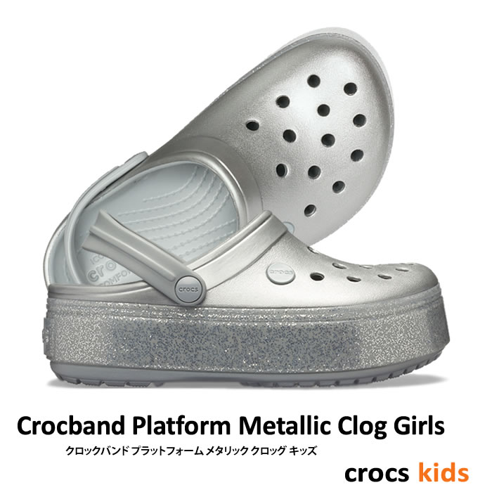 ▲¥2480 送料無料▼ CROCS【クロックス】Crocband Platform Metallic Clog Girls/ クロックバンド プラットフォーム メタリック クロッグ ガールズ/ シルバー|キッズ ケイマン サンダル ビーサン