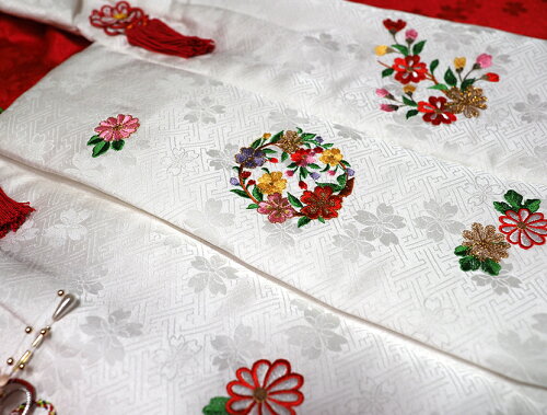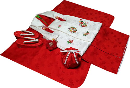 あこがれゆめ.七五三着物女児三歳用セット 正絹 新品 商品説明 白の被布コートに落ち着いた赤系の着物になります 高級正絹綸子地に花の総刺繍になります。
